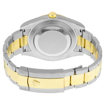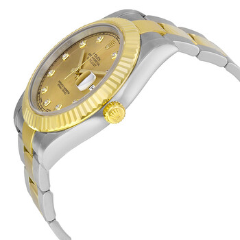 Stainless steel case with a two-tone (silver-tone and yellow gold-tone) stainless steel and 18kt yellow gold rolex oyster bracelet. Fixed fluted 18k yellow gold bezel. Champagne dial with yellow gold hands and diamond hour markers. Minute markers around the outer rim. Dial Type: Analog. Date display at the 3 o'clock position. Rolex Calibre 3136 automatic movement with a 48-hour power reserve. Scratch resistant sapphire crystal. Screw down crown. Solid case back. Case size: 41 mm. Case thickness: 12 mm. Round case shape. Band width: 20 mm. Oysterlock clasp. Water resistant at 100 meters / 330 feet. Functions: date, hour, minute, second, chronometer. Luxury watch style. Watch label: Swiss Made. Rolex Datejust II Champagne Dial Stainless Steel and 18K Yellow Gold Oyster Bracelet Automatic Men's Watch 116333CDO.