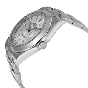Stainless steel case with a stainless steel Rolex oyster bracelet. Fixed domed stainless steel bezel. Silver dial with luminous silver-tone hands and stick hour markers. Minute markers around the outer rim. Dial Type: Analog. Luminescent hands and markers. Date display at the 3 o'clock position. Rolex calibre 3136 automatic movement with a 48-hour power reserve. Scratch resistant sapphire crystal. Screw down crown. Solid case back. Case size: 41 mm. Round case shape. Oysterlock clasp. Water resistant at 100 meters / 330 feet. Functions: date, hour, minute, second. Luxury watch style. Watch label: Swiss Made. Rolex Datejust II Silver Dial Stainless Steel Rolex Oyster Automatic Men's Watch 116300SSO.