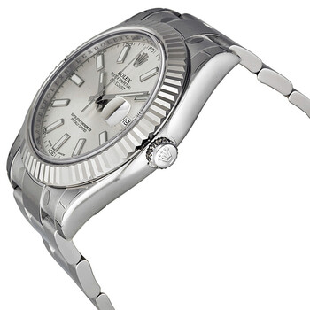 Stainless steel case with a stainless steel Rolex oyster bracelet. Fixed fluted 18kt white gold bezel. Silver dial with silver-tone hands and index hour markers. Minute markers around the outer rim. Dial Type: Analog. Date display at the 3 o'clock position. Automatic movement with a 48-hour power reserve. Scratch resistant sapphire crystal. Screw down crown. Solid case back. Case diameter: 41 mm. Round case shape. Oyster clasp. Water resistant at 100 meters / 330 feet. Functions: date, hour, minute, second. Luxury watch style. Watch label: Swiss Made. Rolex Datejust II Silver Dial Stainless Steel Rolex Oyster Automatic Men's Watch 116334SSO.
