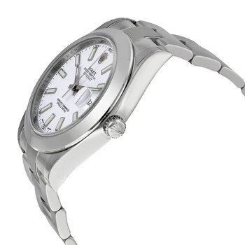 Stainless steel case with a stainless steel Rolex oyster bracelet. Fixed domed stainless steel bezel. White dial with luminous silver-tone hands and index hour markers. Minute markers around the outer rim. Dial Type: Analog. Luminescent hands and markers. Date display at the 3 o'clock position. Automatic movement with a 48-hour power reserve. Scratch resistant sapphire crystal. Screw down crown. Solid case back. Case diameter: 41 mm. Round case shape. Oyster clasp. Water resistant at 100 meters / 330 feet. Functions: date, hour, minute, second. Luxury watch style. Watch label: Swiss Made. Rolex Datejust II White Dial Stainless Steel Rolex Oyster Automatic Men's Watch 116300WSO.
