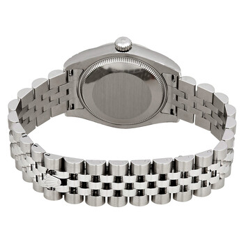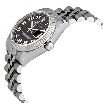 Stainless steel case with a stainless steel rolex jubilee bracelet. Fixed - fluted 18k white gold bezel. Black concentric circle dial with silver-tone hands and Arabic numeral hour markers. Minute markers around the outer rim. Dial Type: Analog. Date display at the 3 o'clock position. Automatic movement. Scratch resistant sapphire crystal. Screw down crown. Solid case back. Case diameter: 31 mm. Round case shape. Concealed crown clasp. Water resistant at 100 meters / 330 feet. Functions: date, hour, minute, second. Luxury watch style. Watch label: Swiss Made. Rolex Datejust Lady 31 Black Concentric Circle Dial Stainless Steel Rolex Jubilee Automatic Watch 178274BKCAJ.