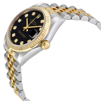 Stainless steel case with a stainless steel Rolex jubilee bracelet with 18kt yellow gold center links. Fixed fluted 18kt yellow gold bezel. Black dial with yellow gold-tone hands and diamond hour markers. Minute markers around the outer rim. Dial Type: Analog. Date display at the 3 o'clock position. Rolex Calibre 2235 automatic movement with a 48-hour power reserve. Scratch resistant sapphire crystal. Screw down crown. Solid case back. Case size: 31 mm. Round case shape. Concealed crown clasp. Water resistant at 100 meters / 330 feet. Functions: date, hour, minute, second, chronometer. Dress watch style. Watch label: Swiss Made. Rolex Datejust Lady 31 Black Dial Stainless Steel and 18K Yellow Gold Rolex Jubilee Automatic Watch 178273BKDJ.