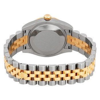 Stainless steel case with a stainless steel Rolex jubilee bracelet with 18kt yellow gold center links. Fixed fluted 18kt yellow gold bezel set with diamonds. Black dial with yellow gold-tone hands and index / Roman numeral hour markers. Minute markers around the outer rim. Dial Type: Analog. Luminescent hands and markers. Date display at the 3 o'clock position. Rolex calibre 2235 automatic movement with a 48-hour power reserve. Scratch resistant sapphire crystal. Screw down crown. Solid case back. Round case shape. Case size: 31 mm. Concealed crown clasp. Water resistant at 100 meters / 330 feet. Functions: date, hour, minute, second, chronometer. Casual watch style. Watch label: Swiss Made. Rolex Datejust Lady 31 Black Dial Stainless Steel and 18K Yellow Gold Jubilee Bracelet Automatic Watch 178313BKSJ.