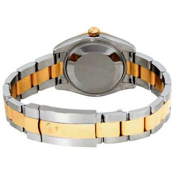 Stainless steel case with a stainless steel Rolex oyster bracelet with 18kt yellow gold center links. Fixed fluted 18kt yellow gold bezel set with diamonds. Black dial with luminous yellow gold-tone hands and index / Roman numeral hour markers. Minute markers around the outer rim. Dial Type: Analog. Luminescent hands and markers. Date display at the 3 o'clock position. Rolex calibre 2235 automatic movement with a 48-hour power reserve. Scratch resistant sapphire crystal. Screw down crown. Solid case back. Round case shape. Case size: 31 mm. Oysterlock clasp. Water resistant at 100 meters / 330 feet. Functions: date, hour, minute, second, chronometer. Luxury watch style. Watch label: Swiss Made. Rolex Datejust Lady 31 Black Dial Stainless Steel and 18K Yellow Gold Oyster Bracelet Automatic Watch 178313BKSO.