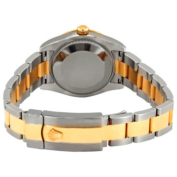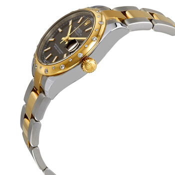 Stainless steel and 18k yellow gold case with a stainless steel and 18k yellow gold rolex oyster bracelet. Fixed - 18k yellow gold diamond-set bezel. Black dial with yellow gold-tone hands and index hour markers. Minute markers around the outer rim. Dial Type: Analog. Luminescent hands and markers. Date display at the 3 o'clock position. Automatic movement. Scratch resistant sapphire crystal. Screw down crown. Case diameter: 31 mm. Round case shape. Oysterclasp clasp. Water resistant at 100 meters / 330 feet. Functions: date, hour, minute, second. Luxury watch style. Watch label: Swiss Made. Rolex Datejust Lady 31 Black Dial Stainless Steel and 18K Yellow Gold Rolex Oyster Automatic Watch 178343BKSO.