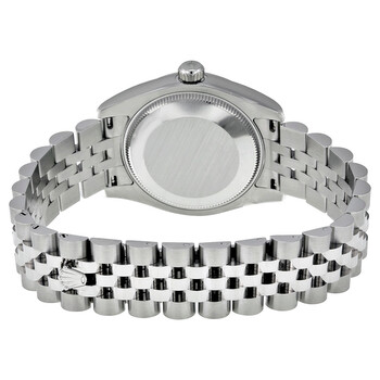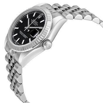 Silver-tone stainless steel case with a silver-tone stainless steel rolex jubilee bracelet. Fixed fluted 18kt white gold bezel. Black dial with luminous silver-tone hands and index / Roman numeral hour markers. Minute markers around the outer rim. Dial Type: Analog. Luminescent hands and dial markers. Date display at the 3 o'clock position. Rolex Calibre 2235 Automatic movement, containing 31 Jewels, bitting at 28800 vph, and has a power reserve of approximately 48 hours. Scratch resistant sapphire crystal. Screw down crown. Solid case back. Round case shape, case size: 31 mm. Deployment clasp. Water resistant at 100 meters / 330 feet. Functions: date, hour, minute, second, chronometer. Additional Info: date displays at 3 o'clock position. Datejust Lady 31 Series. Luxury watch style. Watch label: Swiss Made. Item Variations: 178274, 178274-BKSJ, Rolex-178274, Rolex-178274-BKSJ. Rolex Datejust Lady 31 Black Dial Stainless Steel Jubilee Bracelet Automatic Watch 178274BKSJ.