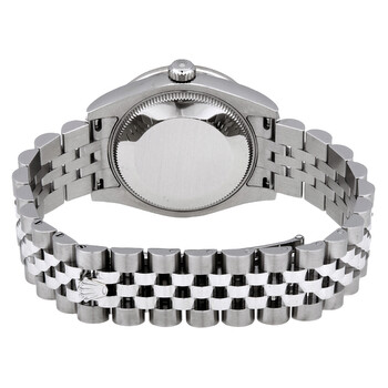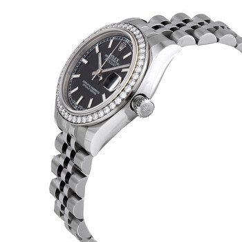 Stainless steel case with a stainless steel Rolex jubilee bracelet. Fixed 18kt white gold bezel set with diamonds. Black dial with luminous silver-tone hands and index hour markers. Minute markers around the outer rim. Dial Type: Analog. Luminescent hands and markers. Date display at the 3 o'clock position. Rolex calibre 2235 automatic movement, containing 31 Jewels, bitting at 28800 vph, and has a power reserve of approximately 48 hours. Scratch resistant sapphire crystal. Screw down crown. Solid case back. Round case shape. Case size: 31 mm. Concealed crown clasp. Water resistant at 100 meters / 330 feet. Functions: date, hour, minute, second, chronometer. Casual watch style. Watch label: Swiss Made. Rolex Datejust Lady 31 Black Dial Stainless Steel Jubilee Bracelet Automatic Watch 178384BKSJ.