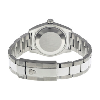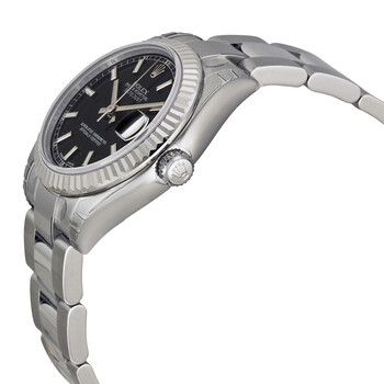 Stainless steel case with a stainless steel Rolex oyster bracelet. Fixed fluted 18kt white gold bezel. Black dial with silver-tone hands and index hour markers. Minute markers around the outer rim. Dial Type: Analog. Luminescent hands and markers. Date display at the 3 o'clock position. Rolex calibre 2235 automatic movement with a 48-hour power reserve. Scratch resistant sapphire crystal. Screw down crown. Solid case back. Case size: 31 mm. Round case shape. Oysterlock clasp. Water resistant at 100 meters / 330 feet. Functions: date, hour, minute, second, chronometer. Luxury watch style. Watch label: Swiss Made. Rolex Datejust Lady 31 Black Dial Stainless Steel Rolex Oyster Automatic Watch 178274BKSO.