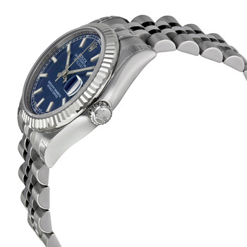 Stainless steel case with a stainless steel rolex jubilee bracelet. Fixed - fluted 18k white gold bezel. Blue dial with silver-tone hands and index hour markers. Minute markers around the outer rim. Dial Type: Analog. Luminescent hands and markers. Date display at the 3 o'clock position. Automatic movement. Scratch resistant sapphire crystal. Screw down crown. Solid case back. Case diameter: 31 mm. Round case shape. Concealed clasp. Water resistant at 100 meters / 330 feet. Functions: date, hour, minute, second. Casual watch style. Watch label: Swiss Made. Rolex Datejust Lady 31 Blue Dial Stainless Steel Rolex Jubilee Automatic Watch 178274BLSJ.