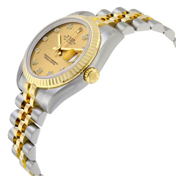 Stainless steel case with a stainless steel Rolex jubilee bracelet with 18kt yellow gold center links. Fixed fluted 18kt yellow gold bezel. Champagne dial with yellow gold-tone hands and diamond hour markers. Dial Type: Analog. Date display at the 3 o'clock position. Rolex calibre 2235 automatic movement with a 48-hour power reserve. Scratch resistant sapphire crystal. Screw down crown. Solid case back. Case size: 31 mm. Round case shape. Crown clasp. Water resistant at 100 meters / 330 feet. Functions: date, hour, minute, second. Luxury watch style. Watch label: Swiss Made. Rolex Datejust Lady 31 Champagne Dial Stainless Steel and 18K Yellow Gold Rolex Jubilee Automatic Watch 178273CDJ.