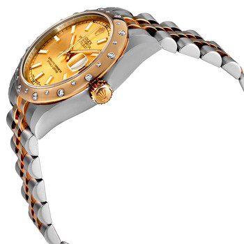 Stainless steel and 18k yellow gold case with a stainless steel and 18k yellow gold rolex jubilee bracelet. Fixed - 18k yellow gold diamond-set bezel. Champagne dial with yellow gold-tone hands and index hour markers. Minute markers around the outer rim. Dial Type: Analog. Luminescent hands and markers. Date display at the 3 o'clock position. Automatic movement. Scratch resistant sapphire crystal. Screw down crown. Solid case back. Case diameter: 31 mm. Round case shape. Concealed crown clasp. Water resistant at 100 meters / 330 feet. Functions: date, hour, minute, second. Casual watch style. Watch label: Swiss Made. Rolex Datejust Lady 31 Champagne Dial Stainless Steel and 18K Yellow Gold Rolex Jubilee Automatic Watch 178343CSJ.