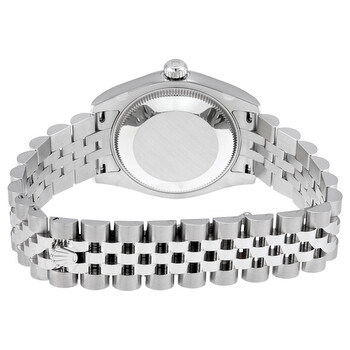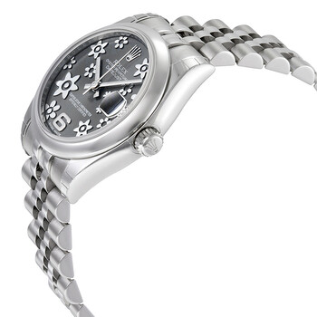 Silver-tone stainless steel case with a silver-tone stainless steel rolex jubilee bracelet. Fixed domed silver-tone stainless steel bezel. Floral rhodium dial with silver-tone hands. Arabic numeral appears at the 6 o'clock position. Dial Type: Analog. Date display at the 3 o'clock position. Rolex Calibre 2235 Automatic movement, containing 31 Jewels, bitting at 28800 vph, and has a power reserve of approximately 48 hours. Scratch resistant sapphire crystal. Screw down crown. Solid case back. Round case shape, case size: 31 mm. Concealed crown clasp. Water resistant at 100 meters / 330 feet. Functions: date, hour, minute, second, chronometer. Datejust Lady 31 Series. Luxury watch style. Watch label: Swiss Made. Rolex Datejust Lady 31 Floral Rhodium Dial Stainless Steel Jubilee Bracelet Automatic Watch 178240RFJ.
