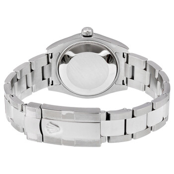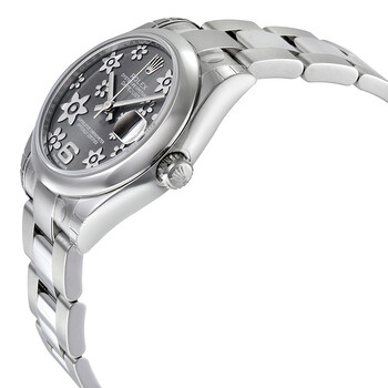 Silver-tone stainless steel case with a silver-tone stainless steel rolex oyster bracelet. Fixed domed silver-tone stainless steel bezel. Floral rhodium dial with silver-tone hands. Arabic numeral appears at the 6 o'clock position. Dial Type: Analog. Date display at the 3 o'clock position. Rolex Calibre 2235 Automatic movement, containing 31 Jewels, bitting at 28800 vph, and has a power reserve of approximately 48 hours. Scratch resistant sapphire crystal. Screw down crown. Solid case back. Round case shape, case size: 31 mm. Oysterlock clasp. Water resistant at 100 meters / 330 feet. Functions: date, hour, minute, second, chronometer. Datejust Lady 31 Series. Luxury watch style. Watch label: Swiss Made. Rolex Datejust Lady 31 Floral Rhodium Dial Stainless Steel Oyster Bracelet Automatic Watch 178240RFO.