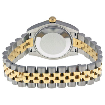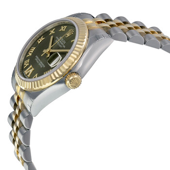 Stainless steel and 18k yellow gold case with a stainless steel and 18k yellow gold rolex jubilee bracelet. Fixed - fluted 18k yellow gold bezel. Green dial with yellow gold-tone hands and Roman numeral hour markers. Diamond-set roman numeral at 6 o'clock. Dial Type: Analog. Date display at the 3 o'clock position. Automatic movement. Scratch resistant sapphire crystal. Screw down crown. Solid case back. Case diameter: 31 mm. Round case shape. Concealed folding crown clasp. Water resistant at 100 meters / 330 feet. Functions: date, hour, minute, second. Luxury watch style. Watch label: Swiss Made. Rolex Datejust Lady 31 Green Dial Stainless Steel and 18K Yellow Gold Rolex Jubilee Automatic Watch 178273GNRJ.