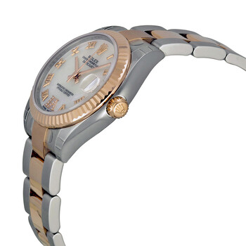 Stainless steel and 18k everose gold case with a stainless steel and 18k everose gold rolex oyster bracelet. Fixed - fluted 18k everose gold bezel. Mother of pearl dial with rose gold-tone hands and Roman numeral hour markers. Dial Type: Analog. Date display at the 3 o'clock position. Automatic movement. Scratch resistant sapphire crystal. Screw down crown. Case diameter: 31 mm. Case thickness: 14 mm. Round case shape. Band width: 20 mm. Deployment clasp. Water resistant at 100 meters / 330 feet. Functions: date, hour, minute, second. Luxury watch style. Watch label: Swiss Made. Rolex Datejust Lady 31 Mother of Pearl Dial Stainless Steel and 18K Everose Gold Rolex Oyster Automatic Watch 178271MRO.