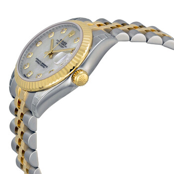 Stainless steel case with a stainless steel Rolex jubilee bracelet with 18kt yellow gold center links. Fixed fluted 18kt yellow gold bezel. Mother of pearl dial with yellow gold hands and diamond hour markers. Dial Type: Analog. Date display at the 3 o'clock position. Rolex Calibre 2235 automatic movement with a 48-hour power reserve. Scratch resistant sapphire crystal. Screw down crown. Solid case back. Case size: 31 mm. Round case shape. Concealed crown clasp. Water resistant at 100 meters / 330 feet. Functions: date, hour, minute, second. Luxury watch style. Watch label: Swiss Made. Rolex Datejust Lady 31 Mother of Pearl Dial Stainless Steel and 18K Yellow Gold Rolex Jubilee Automatic Watch 178273MDJ.