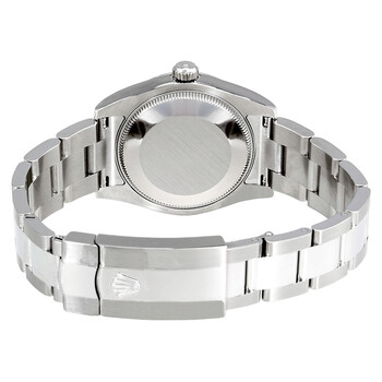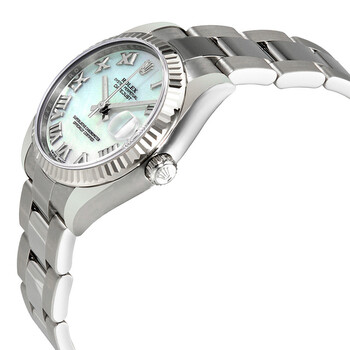 Stainless steel case with a stainless steel Rolex oyster bracelet. Fixed fluted 18kt white gold bezel. Mother of pearl dial with silver-tone hands and Roman numeral hour markers. Dial Type: Analog. Date display at the 3 o'clock position. Automatic movement with a 48-hour power reserve. Scratch resistant sapphire crystal. Screw down crown. Solid case back. Case diameter: 31 mm. Round case shape. Oysterclasp clasp. Water resistant at 100 meters / 330 feet. Functions: date, hour, minute, second. Luxury watch style. Watch label: Swiss Made. Rolex Datejust Lady 31 Mother of Pearl Dial Stainless Steel Rolex Oyster Automatic Watch 178274MRO.