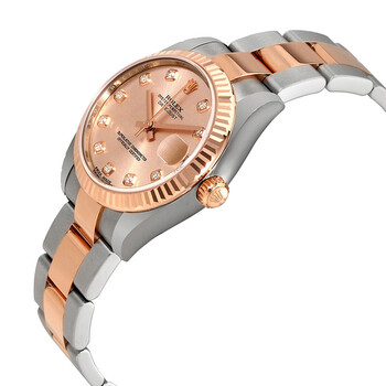 Stainless steel case with a stainless steel Rolex oyster bracelet with 18kt everose gold center links. Fixed fluted 18kt everose gold bezel. Pink dial with rose gold-tone hands and diamond hour markers. Dial Type: Analog. Date display at the 3 o'clock position. Rolex calibre 2235 automatic movement with a 48-hour power reserve. Scratch resistant sapphire crystal. Screw down crown. Solid case back. Case size: 31 mm. Round case shape. Oysterlock clasp. Water resistant at 100 meters / 330 feet. Functions: date, hour, minute, second, chronometer. Casual watch style. Watch label: Swiss Made. Rolex Datejust Lady 31 Pink Dial Stainless Steel and 18K Everose Gold Rolex Oyster Automatic Watch 178271PDO.