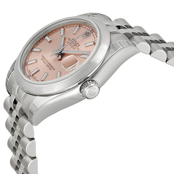 Silver-tone stainless steel case with a silver-tone stainless steel rolex jubilee bracelet. Fixed domed silver-tone stainless steel bezel. Pink dial with luminous silver-tone tone hands and index / Roman numeral hour markers. Minute markers around the outer rim. Dial Type: Analog. Luminescent hands and markers. Date display at the 3 o'clock position. Rolex Calibre 2235 Automatic movement, containing 31 Jewels, bitting at 28800 vph, and has a power reserve of approximately 48 hours. Scratch resistant sapphire crystal. Screw down crown. Solid case back. Round case shape, case size: 31 mm. Concealed crown clasp. Water resistant at 100 meters / 330 feet. Functions: date, hour, minute, second, chronometer. Datejust Lady 31 Series. Luxury watch style. Watch label: Swiss Made. Rolex Datejust Lady 31 Pink Dial Stainless Steel Jubilee Bracelet Automatic Watch 178240PSJ.