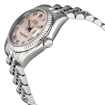 Stainless steel case with a stainless steel Rolex jubilee bracelet. Fixed fluted 18kt white gold bezel. Pink dial with silver-tone hands and Roman numeral hour markers. Minute markers around the outer rim. Dial Type: Analog. Date display at the 3 o'clock position. Automatic movement with a 48-hour power reserve. Scratch resistant sapphire crystal. Solid case back. Case diameter: 31 mm. Round case shape. Deployment clasp. Water resistant at 100 meters / 330 feet. Functions: date, hour, minute, second. Luxury watch style. Watch label: Swiss Made. Rolex Datejust Lady 31 Pink Dial Stainless Steel Rolex Jubilee Automatic Watch 178274PRJ.