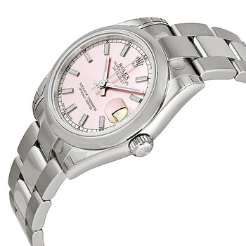 Stainless steel case with a stainless steel Rolex oyster bracelet. Fixed domed stainless steel bezel. Pink dial with luminous silver-tone hands and index / small Roman numeral hour markers. Minute markers around the outer rim. Dial Type: Analog. Luminescent hands and dial markers. Date display at the 3 o'clock position. Rolex Calibre 2235 Automatic movement, containing 31 Jewels, bitting at 28800 vph, and has a power reserve of approximately 48 hours. Scratch resistant sapphire crystal. Screw down crown. Solid case back. Round case shape. Case size: 31 mm. Oysterlock clasp. Water resistant at 100 meters / 330 feet. Functions: date, hour, minute, second, chronometer. Datejust Lady 31 Series. Luxury watch style. Watch label: Swiss Made. Item Variations: 178240, 178240-PSO, Rolex-178240, Rolex-178240-PSO. Rolex Datejust Lady 31 Pink Dial Stainless Steel Oyster Bracelet Automatic Watch 178240PSO.