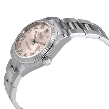 Stainless steel case with a stainless steel rolex oyster bracelet. Fixed - fluted 18k white gold bezel. Pink dial with silver-tone hands and Roman numeral hour markers. Minute markers around the outer rim. Dial Type: Analog. Date display at the 3 o'clock position. Automatic movement. Scratch resistant sapphire crystal. Screw down crown. Case diameter: 31 mm. Round case shape. Oysteclasp clasp. Water resistant at 100 meters / 330 feet. Functions: date, hour, minute, second. Luxury watch style. Watch label: Swiss Made. Rolex Datejust Lady 31 Pink Dial Stainless Steel Rolex Oyster Automatic Watch 178274PRO.