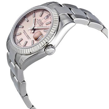 Stainless steel case with a stainless steel Rolex oyster bracelet. Fixed fluted 18kt white gold bezel. Pink dial with silver-tone hands and luminous stick hour markers. Minute markers around the outer rim. Dial Type: Analog. Luminescent hands and dial markers. Date display at the 3 o'clock position. Rolex calibre 2235 automatic movement with a 48-hour power reserve. Scratch resistant sapphire crystal. Solid case back. Case size: 31 mm. Round case shape. Oysterlock clasp. Water resistant at 100 meters / 330 feet. Functions: date, hour, minute, second. Luxury watch style. Watch label: Swiss Made. Item Variations: 178274, 178274-PSO, Rolex-178274, Rolex-178274-PSO. Rolex Datejust Lady 31 Pink Dial Stainless Steel Rolex Oyster Automatic Watch 178274PSO.