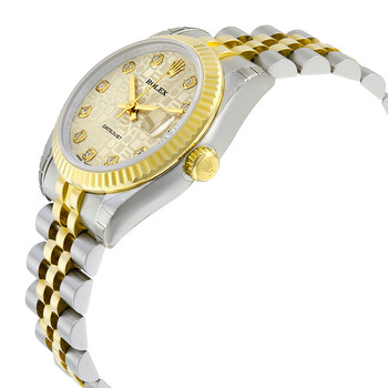 Stainless steel case with a stainless steel Rolex jubilee bracelet with 18kt yellow gold center links. Fixed fluted 18kt yellow gold bezel. Silver dial with yellow gold-tone hands and diamond hour markers. Dial Type: Analog. Date display at the 3 o'clock position. Rolex calibre 2235 automatic movement with a 48-hour power reserve. Scratch resistant sapphire crystal. Screw down crown. Solid case back. Case size: 31 mm. Round case shape. Concealed crown clasp. Water resistant at 100 meters / 330 feet. Functions: date, hour, minute, second. Luxury watch style. Watch label: Swiss Made. Rolex Datejust Lady 31 Silver Dial Stainless Steel and 18K Yellow Gold Rolex Jubilee Automatic Watch 178273SJDJ.