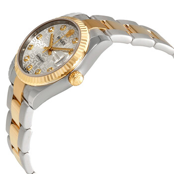 Stainless steel and 18k yellow gold case with a stainless steel and 18k yellow gold rolex oyster bracelet. Fixed - fluted 18k yellow gold bezel. Silver jubilee dial with yellow gold-tone hands and diamond hour markers. Dial Type: Analog. Date display at the 3 o'clock position. Automatic movement. Scratch resistant sapphire crystal. Screw down crown. Case diameter: 31 mm. Round case shape. Oysterclasp clasp. Water resistant at 100 meters / 330 feet. Functions: date, hour, minute, second. Luxury watch style. Watch label: Swiss Made. Rolex Datejust Lady 31 Silver Jubilee Dial Stainless Steel and 18K Yellow Gold Rolex Oyster Automatic Watch 178273SJDO.