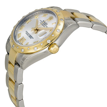 Stainless steel case with a stainless steel Rolex oyster bracelet with 18kt yellow gold center links. Fixed 18kt yellow gold diamond-set bezel. Silver dial with yellow gold-tone hands and Roman numeral hour markers. Dial Type: Analog. Date display at the 3 o'clock position. Rolex calibre 2235 automatic movement with a 48-hour power reserve. Scratch resistant sapphire crystal. Screw down crown. Solid case back. Case size: 31 mm. Round case shape. Oysterlock clasp. Water resistant at 100 meters / 330 feet. Functions: date, hour, minute, second. Luxury watch style. Watch label: Swiss Made. Rolex Datejust Lady 31 Silver Dial Stainless Steel and 18K Yellow Gold Rolex Oyster Automatic Watch 178343SRDO.