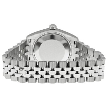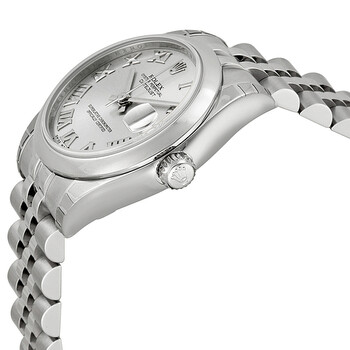 Stainless steel case with a stainless steel Rolex jubilee bracelet. Fixed domed stainless steel bezel. Silver dial with silver-tone hands and Roman numeral hour markers. Dial Type: Analog. Date display at the 3 o'clock position. Automatic movement with a 48-hour power reserve. Scratch resistant sapphire crystal. Screw down crown. Solid case back. Case diameter: 31 mm. Round case shape. Concealed crown clasp. Water resistant at 100 meters / 330 feet. Functions: date, hour, minute, second. Luxury watch style. Watch label: Swiss Made. Rolex Datejust Lady 31 Silver Dial Stainless Steel Rolex Jubilee Automatic Watch 178240SRJ.