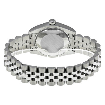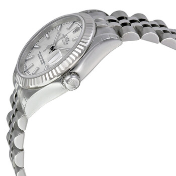 Stainless steel case with a stainless steel rolex jubilee bracelet. Fixed fluted 18kt white gold bezel. Silver jubilee dial with luminous silver-tone hands and index / Roman numeral hour markers. Minute markers around the outer rim. Dial Type: Analog. Luminescent hands and dial markers. Date display at the 3 o'clock position. Rolex Calibre 2235 automatic movement with a 48-hour power reserve. Scratch resistant sapphire crystal. Screw down crown. Solid case back. Case size: 31 mm. Round case shape. Deployment clasp. Water resistant at 100 meters / 330 feet. Functions: date, hour, minute, second, chronometer. Additional Info: date displays at 3 o'clock position. Luxury watch style. Watch label: Swiss Made. Item Variations: 178274, 178274-SSJ, Rolex-178274, Rolex-178274-SSJ. Rolex Datejust Lady 31 Silver Jubilee Dial Stainless Steel Rolex Jubilee Automatic Watch 178274SSJ.