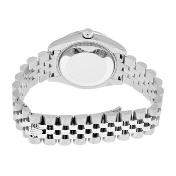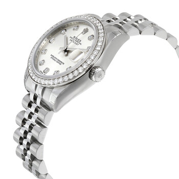 Stainless steel case with a stainless steel Rolex jubilee bracelet. Fixed 18kt white gold bezel set with diamonds. Silver dial with silver-tone hands and diamond hour markers. Dial Type: Analog. Date display at the 3 o'clock position. Automatic movement with a 48-hour power reserve. Scratch resistant sapphire crystal. Screw down crown. Solid case back. Case diameter: 31 mm. Round case shape. Concealed crown clasp. Water resistant at 100 meters / 330 feet. Functions: date, hour, minute, second. Dress watch style. Watch label: Swiss Made. Rolex Datejust Lady 31 Silver Dial Stainless Steel Rolex Jubilee Automatic Watch 178384SDJ.