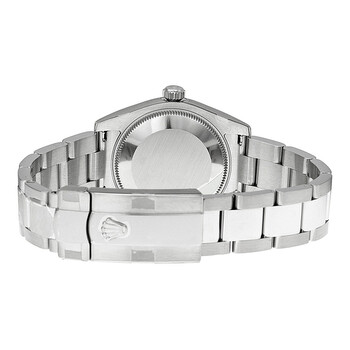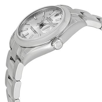 Silver-tone stainless steel case with a silver-tone stainless steel rolex oyster bracelet. Fixed domed silver-tone stainless steel bezel. Silver dial with luminous silver-tone hands and index / Roman numeral hour markers. Minute markers around the outer rim. Dial Type: Analog. Luminescent hands and dial markers. Date display at the 3 o'clock position. Rolex Calibre 2235 Automatic movement, containing 31 Jewels, bitting at 28800 vph, and has a power reserve of approximately 48 hours. Scratch resistant sapphire crystal. Screw down crown. Solid case back. Round case shape, case size: 31 mm. Oysterlock clasp. Water resistant at 100 meters / 330 feet. Functions: date, hour, minute, second, chronometer. Datejust Lady 31 Series. Luxury watch style. Watch label: Swiss Made. Item Variations: 178240, 178240-SSO, Rolex-178240, Rolex-178240-SSO. Rolex Datejust Lady 31 Silver Dial Stainless Steel Oyster Bracelet Automatic Watch 178240SSO.