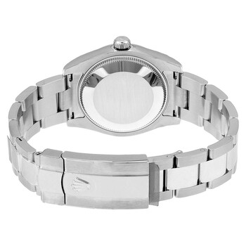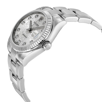 Stainless steel case with a stainless steel Rolex oyster bracelet. Fixed fluted 18kt white gold bezel. Silver jubilee dial with silver-tone hands and diamond hour markers. Dial Type: Analog. Date display at the 3 o'clock position. Rolex Calibre 2235 automatic movement with about 48 hours of power reserve. Scratch resistant sapphire crystal. Screw down crown. Solid case back. Case size: 31 mm. Round case shape. Oysterlock clasp. Water resistant at 100 meters / 330 feet. Functions: date, hour, minute, second, chronometer. Luxury watch style. Watch label: Swiss Made. Rolex Datejust Lady 31 Silver Jubilee Dial Stainless Steel Rolex Oyster Automatic Watch 178274SJDO.