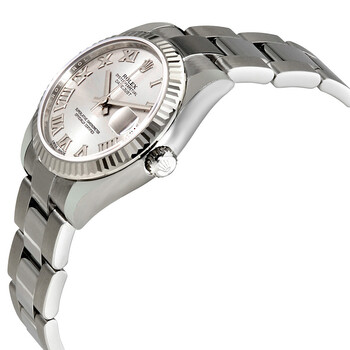 Stainless steel case with a stainless steel Rolex oyster bracelet. Fixed fluted 18kt white gold bezel. Silver dial with silver-tone hands and Roman numeral hour markers. Dial Type: Analog. Date display at the 3 o'clock position. Automatic movement with a 48-hour power reserve. Scratch resistant sapphire crystal. Screw down crown. Case diameter: 31 mm. Round case shape. Oysterlock clasp. Water resistant at 100 meters / 330 feet. Functions: date, hour, minute, second. Luxury watch style. Watch label: Swiss Made. Rolex Datejust Lady 31 Silver Dial Stainless Steel Rolex Oyster Automatic Watch 178274SRO.