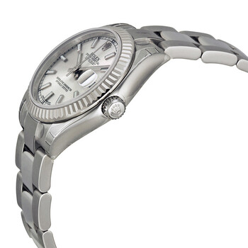 Stainless steel case with a stainless steel rolex oyster bracelet. Fixed fluted 18kt white gold bezel. Silver dial with luminous silver-tone hands and index / Roman numeral hour markers. Minute markers around the outer rim. Dial Type: Analog. Luminescent hands and dial markers. Date display at the 3 o'clock position. Rolex calibre 2235 automatic movement with a 48 hour power reserve. Scratch resistant sapphire crystal. Screw down crown. Solid case back. Case size: 31 mm. Round case shape. Oysterlock clasp. Water resistant at 100 meters / 330 feet. Functions: date, hour, minute, second. Luxury watch style. Watch label: Swiss Made. Rolex Datejust Lady 31 Silver Dial Stainless Steel Rolex Oyster Automatic Watch 178274SSO.