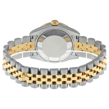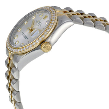 Stainless steel case with a stainless steel Rolex jubilee bracelet with 18kt yellow gold center links. Fixed 18kt yellow gold set with diamonds bezel. Silver dial with tellow gold-tone hands and diamond hour markers. Dial Type: Analog. Date display at the 3 o'clock position. Rolex calibre 2235 automatic movement with a 48-hour power reserve. Scratch resistant sapphire crystal. Screw down crown. Solid case back. Case size: 31 mm. Round case shape. Concealed crown clasp. Water resistant at 100 meters / 330 feet. Functions: date, hour, minute, second. Luxury watch style. Watch label: Swiss Made. Rolex Datejust Lady 31 Silver Diamond Dial Steel and 18K Yellow Gold Jubilee Watch 178383SDJ.