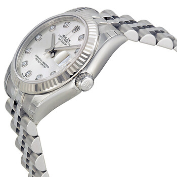 Stainless steel case with a stainless steel Rolex jubilee bracelet. Fixed fluted 18kt white gold bezel. Silver dial with silver-tone hands and diamond hour markers. Dial Type: Analog. Date display at the 3 o'clock position. Rolex calibre 2235 automatic movement with a 48-hour power reserve. Scratch resistant sapphire crystal. Screw down crown. Solid case back. Case size: 31 mm. Round case shape. Deployment clasp. Water resistant at 100 meters / 330 feet. Functions: date, hour, minute, second. Additional Info: date displays at 3 o'clock position. Luxury watch style. Watch label: Swiss Made. Item Variations: 178274, 178274-SDJ , Rolex-178274, Rolex-178274-SDJ 178274, 178274-SDJ, Rolex-17. Rolex Datejust Lady 31 Silver With 11 Diamonds Dial Stainless Steel Rolex Jubilee Automatic Watch 178274SDJ.