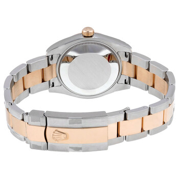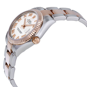 Stainless steel case with a stainless steel Rolex oyster bracelet with 18kt everose gold center links. Fixed fluted 18kt everose gold bezel. White dial with rose gold-tone hands and Roman numeral hour markers. Minute markers around the outer rim. Dial Type: Analog. Date display at the 3 o'clock position. Rolex calibre 2235 automatic movement with a 48-hour power reserve. Scratch resistant sapphire crystal. Screw down crown. Solid case back. Case size: 31 mm. Round case shape. Oysterlock clasp. Water resistant at 100 meters / 330 feet. Functions: date, hour, minute, second, chronometer. Casual watch style. Watch label: Swiss Made. Rolex Datejust Lady 31 White Dial Stainless Steel and 18K Everose Gold Oyster Bracelet Automatic Watch 178271WRO.