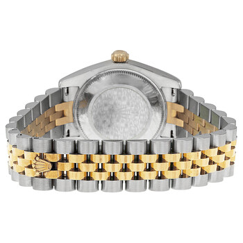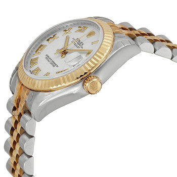 Stainless steel case with a stainless steel Rolex jubilee bracelet with 18kt gold center links. Fixed fluted 18kt gold bezel. White dial with gold-tone hands and Roman numeral hour markers. Minute markers around the outer rim. Dial Type: Analog. Date display at the 3 o'clock position. Rolex calibre 2235 automatic movement with a 48-hour power reserve. Scratch resistant sapphire crystal. Screw down crown. Solid case back. Case size: 31 mm. Round case shape. Concealed crown clasp. Water resistant at 100 meters / 330 feet. Functions: date, hour, minute, second. Luxury watch style. Watch label: Swiss Made. Rolex Datejust Lady 31 White Dial Stainless Steel and 18K Yellow Gold Rolex Jubilee Automatic Watch 178273WRJ.
