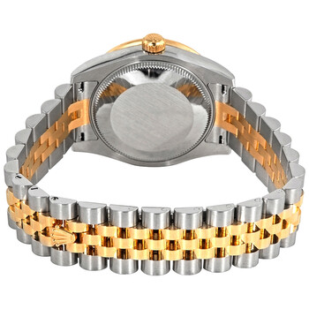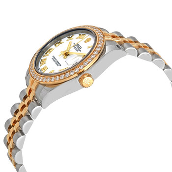 Stainless steel and 18k yellow gold case with a stainless steel and 18k yellow gold rolex jubilee bracelet. Fixed - 18k yellow gold diamond-set bezel. White dial with yellow gold-tone hands and Roman numeral hour markers. Minute markers around the outer rim. Dial Type: Analog. Date display at the 3 o'clock position. Automatic movement. Scratch resistant sapphire crystal. Screw down crown. Solid case back. Case diameter: 31 mm. Round case shape. Concealed crown clasp. Water resistant at 100 meters / 330 feet. Functions: date, hour, minute, second. Luxury watch style. Watch label: Swiss Made. Rolex Datejust Lady 31 White Dial Stainless Steel and 18K Yellow Gold Rolex Jubilee Automatic Watch 178383WRJ.