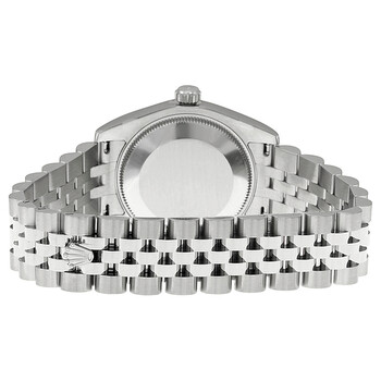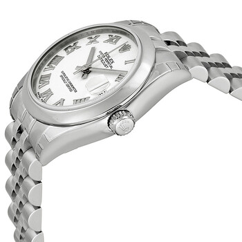 Silver-tone stainless steel case with a silver-tone stainless steel rolex jubilee bracelet. Fixed domed silver-tone stainless steel bezel. White dial with silver-tone hands and Roman numeral hour markers. Minute markers around the outer rim. Dial Type: Analog. Date display at the 3 o'clock position. Rolex Calibre 2235 Automatic movement, containing 31 Jewels, bitting at 28800 vph, and has a power reserve of approximately 48 hours. Scratch resistant sapphire crystal. Screw down crown. Solid case back. Round case shape, case size: 31 mm. Concealed crown clasp. Water resistant at 100 meters / 330 feet. Functions: date, hour, minute, second, chronometer. Datejust Lady 31 Series. Luxury watch style. Watch label: Swiss Made. Rolex Datejust Lady 31 White Dial Stainless Steel Jubilee Bracelet Automatic Watch 178240WRJ.