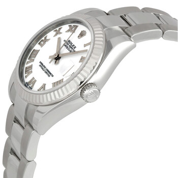 Stainless steel case with a stainless steel rolex oyster bracelet. Fixed fluted 18k white gold bezel. White dial with silver-tone hands and Roman numeral hour markers. Dial Type: Analog. Date display at the 3 o'clock position. Automatic movement. Scratch resistant sapphire crystal. Case diameter: 31 mm. Round case shape. Water resistant at 100 meters / 330 feet. Functions: date, hour, minute, second. Luxury watch style. Watch label: Swiss Made. Rolex Datejust Lady 31 White Dial Stainless Steel Rolex Oyster Automatic Watch 178274WRO.
