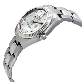 Stainless steel case with a stainless steel rolex oyster bracelet. Fixed - fluted 18k white gold bezel. White goldust mother of pearl dial with silver-tone hands and Arabic numeral and diamond hour markers. Minute markers around the outer rim. Dial Type: Analog. Date display at the 3 o'clock position. Automatic movement. Scratch resistant sapphire crystal. Screw down crown. Case diameter: 31 mm. Round case shape. Oysterclasp clasp. Water resistant at 100 meters / 330 feet. Functions: date, hour, minute, second. Luxury watch style. Watch label: Swiss Made. Rolex Datejust Lady 31 White Goldust Mother of Pearl Dial Stainless Steel Rolex Oyster Automatic Watch 178274WGDMADO.