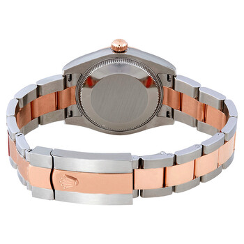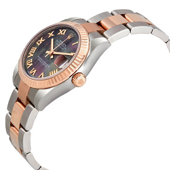 Stainless steel case with a stainless steel Rolex oyster bracelet with 18kt everose goldcenter links. Fixed fluted 18kt everose gold bezel. Black mother of pearl dial with rose gold-tone hands and Roman numeral hour markers. Dial Type: Analog. Date display at the 3 o'clock position. Rolex calibre 2235 automatic movement with a 48-hour power reserve. Scratch resistant sapphire crystal. Screw down crown. Solid case back. Case size: 31 mm. Case thickness: 14 mm. Round case shape. Band width: 20 mm. Oysterlock clasp. Water resistant at 100 meters / 330 feet. Functions: date, hour, minute, second, chronometer. Luxury watch style. Watch label: Swiss Made. Rolex Datejust Lady Automatic Black Mother of Pearl Dial Watch 178271BMRO.