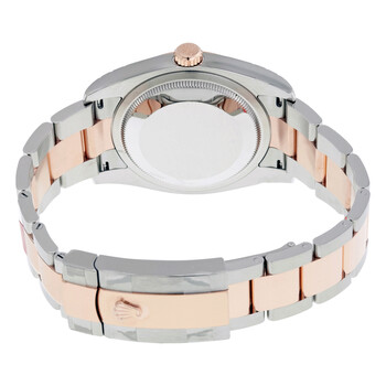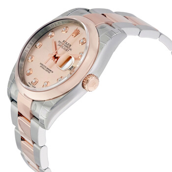 Stainless steel case with a stainless steel Rolex oyster bracelet with 18kt everose gold center links. Fixed 18kt everose gold bezel. Pink dial with rose gold hands and diamond hour markers. Dial Type: Analog. Date display at the 3 o'clock position. Automatic movement with a 50-hour power reserve. Scratch resistant sapphire crystal. Screw down crown. Solid case back. Case size: 36 mm. Round case shape. Oysterlock clasp. Water resistant at 100 meters / 330 feet. Functions: date, hour, minute, second. Luxury watch style. Watch label: Swiss Made. Rolex Datejust Pink Diamond Dial Steel and 18K Everose Gold Men's Watch 116201PDO.
