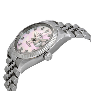 Stainless steel case with a stainless steel Rolex jubilee bracelet. Fixed fluted 18kt white gold bezel. Pink mother of pearl dial with silver-tone hands and diamond hour markers. Dial Type: Analog. Date display at the 3 o'clock position. Rolex calibre 3135 automatic movement with a 50-hour power reserve. Scratch resistant sapphire crystal. Screw down crown. Solid case back. Case size: 36 mm. Round case shape. Water resistant at 100 meters / 330 feet. Functions: date, hour, minute, second. Luxury watch style. Watch label: Swiss Made. Rolex Datejust Pink Mother of Pearl Diamond Dial Steel and 18K White Gold Ladies Watch 116234PMDJ.