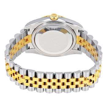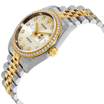 Stainless steel case with a stainless steel Rolex jubilee bracelet with 18kt yellow gold center links. Fixed 18kt yellow gold bezel set with diamonds. Silver jubilee dial with yellow gold-tone one hands and diamond hour markers. Dial Type: Analog. Date display at the 3 o'clock position. Rolex calibre 3135 automatic movement with a 48-hour power reserve. Scratch resistant sapphire crystal. Screw down crown. Solid case back. Case size: 36 mm. Round case shape. Concealed crown clasp. Water resistant at 100 meters / 330 feet. Functions: date, hour, minute, second. Casual watch style. Watch label: Swiss Made. Rolex Datejust Silver Jubilee Dial Automatic Stainless Steel and 18 Carat Yellow Gold Ladies Watch 116243SJDJ.
