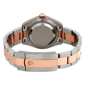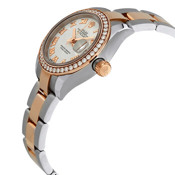 Stainless steel case with a stainless steel and 18k everose gold rolex oyster bracelet. Fixed-diamond set 18k everose gold bezel. White dial with everose gold hands and Roman numeral hour markers. Dial Type: Analog. Date display at the 3 o'clock position. Rolex Calibre 2236 automatic movement with a 55-hour power reserve. Scratch resistant sapphire crystal. Screw down crown. Solid case back. Round case shape. Case size: 28 mm. Water resistant at 100 meters / 330 feet. Functions: date, hour, minute, second. Additional Info: bezel set with 46 diamonds. Luxury watch style. Watch label: Swiss Made. Rolex Datejust White Dial Automatic Ladies Steel and 18K Everose Gold Oyster Watch 279381WRO.